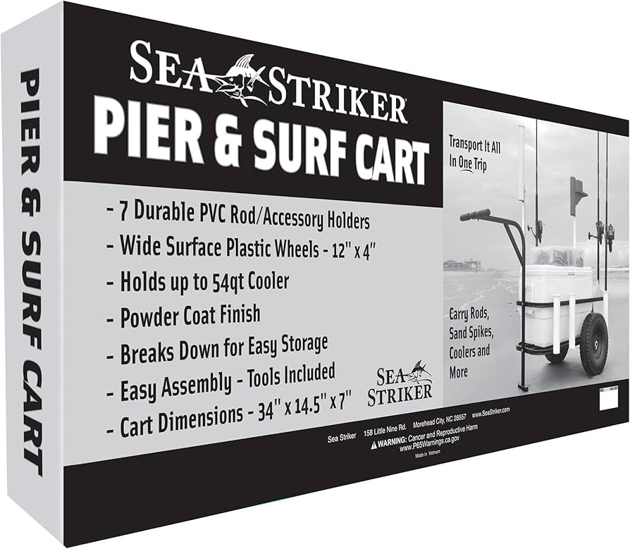 Pier/Beach/Surf Cart: This all-around, versatile cart has a heavy-duty frame and comes with the capability to hold up to MOST 54 quart coolers. Carry beach chairs, sun shades, fishing rods, tackle bag, bait bucket, and more. Transport it all in one trip. Includes a frame with seven durable PVC fishing rod/accessory holders
